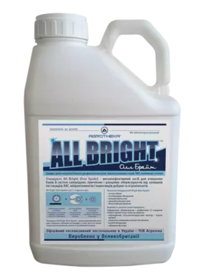У компанії Агротека є продукт під назвою All Bright (Олл Брайт). Це високоефективний засіб для очищення баків й систем самохідних, причіпних та ранцевих обприскувачів від залишків пестицидів, КАС, мікроелементів та інших видів добрив та агрохімікатів.
